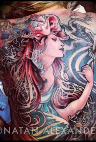 满背彩色的神秘女子与鸽子纹身图案