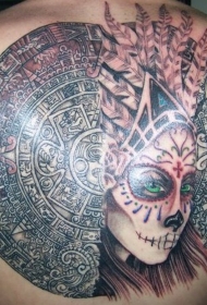 背部惊人的血腥玛雅石雕结合部落妇女肖像纹身图案