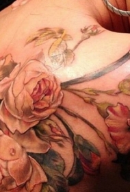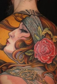 背部美丽的女人肖像与红玫瑰花纹身图案