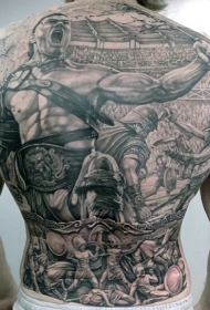 背部独特的黑色斯巴达战士头盔和剑纹身图案