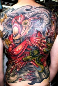 背部令人难以置信的五恶魔山羊和蛇和昆虫纹身图案