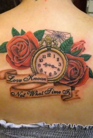 背部漂亮的五彩天鹅皇冠与花朵纹身图案