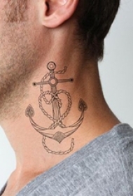 男生脖子上黑色素描创意海军风船锚纹身图片