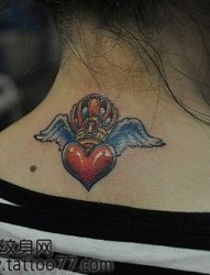 潮流好看的颈部爱心翅膀皇冠纹身图片