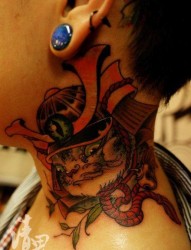 男人脖子处经典的穿头盔的猫咪纹身图片