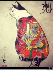 日式传统纹身猫不动明王彩色纹身图案手稿