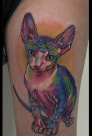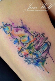 可爱的小猫与书本七彩泼墨风格大腿纹身图案