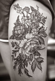 女性腿部灰色大花纹身图案