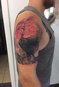 男生肩部黑色抽象线条山纹身和鹰纹身风景图片