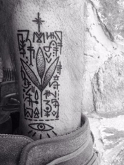 男生手臂上黑灰几何元素抽象线条英文单词和徽章纹身图片