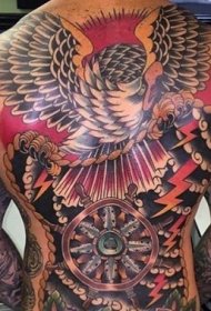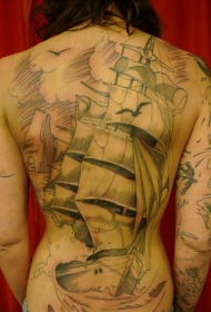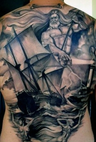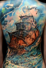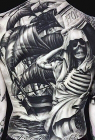 背部惊人的大规模船舶和骷髅骨架纹身图案