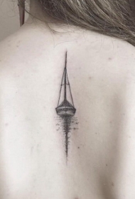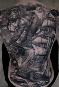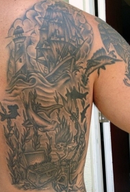 背部神奇的黑白帆船灯塔和水下世界纹身图案