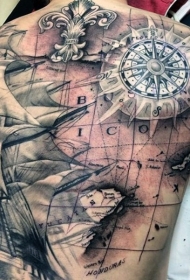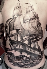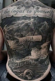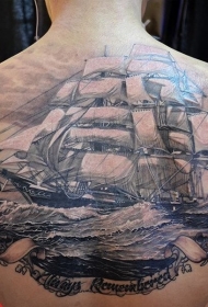 背部航海主题黑白帆船骷髅和字母纹身图案