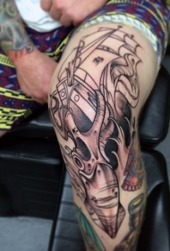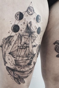 大腿雕刻风格黑色帆船与月亮周期和鲸鱼纹身图案