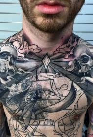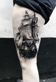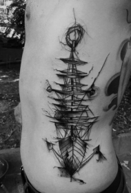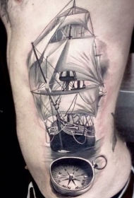 侧肋写实风格的黑白帆船与指南针纹身图案