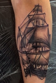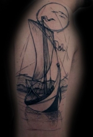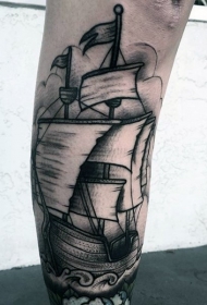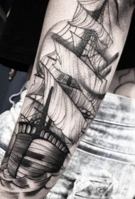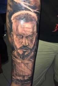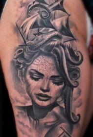 小臂old school黑白帆船与神秘女子肖像纹身图案