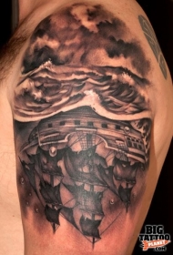手臂黑白鲨鱼头和海盗帆船纹身图案
