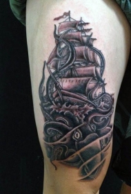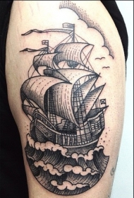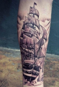 手臂惊人的黑灰海盗船与骷髅纹身图案