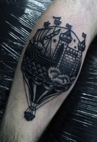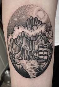 小臂old school黑色点刺神秘岛与帆船纹身图案