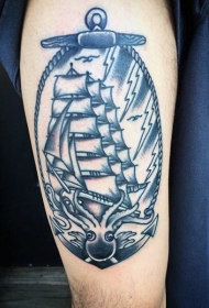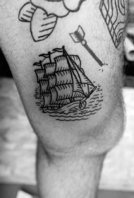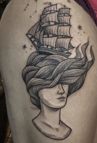 大腿黑色线条点刺神秘女子与帆船纹身图案