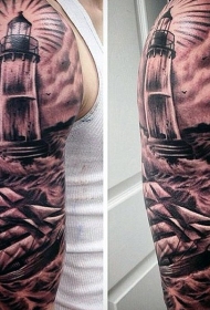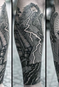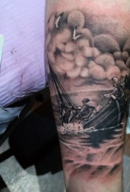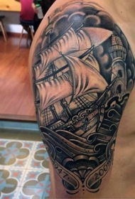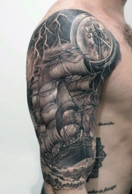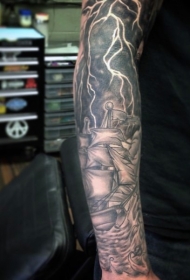 大臂华丽的写实黑灰帆船和风暴纹身图案