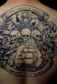 背后黑灰色海盗头骨和船纹身图案