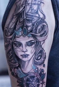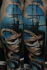 小腿帆船女人肖像和章鱼纹身图案