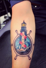 手臂漂亮的彩色船舵灯塔纹身图案
