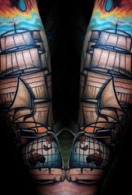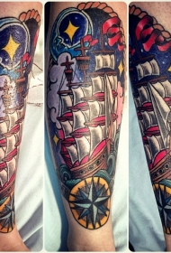 手臂新风格的彩色帆船与夜空纹身图案