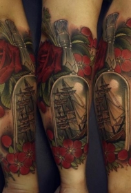 手臂现代风格的彩色瓶子与花朵纹身