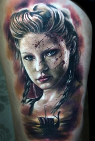 大腿恐怖风格女人脸和海盗船纹身图案