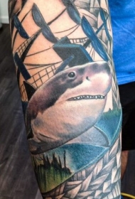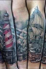 手臂现实主义风格的彩色帆船和灯塔纹身