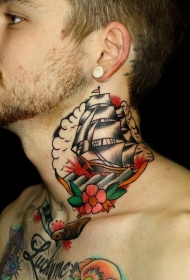 男性脖子老派风格的彩色船与花纹身