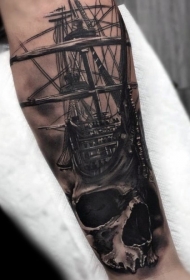 手臂现实主义风格的彩色帆船与骷髅纹身
