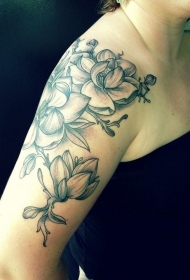 肩部现代传统风格的彩色麦克风与玫瑰花纹身