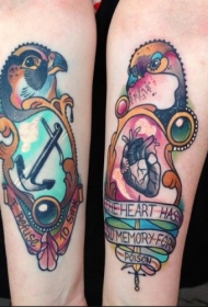 手臂新传统风格的彩色鸟与心脏纹身图案