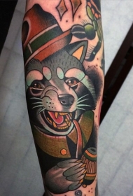手臂新传统风格的彩色吸烟管浣熊纹身