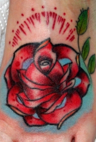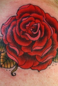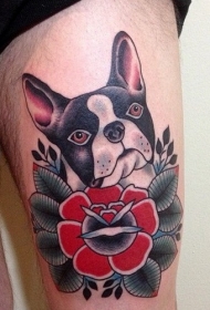 腿部老学校传统的红玫瑰与旗帜字母纹身
