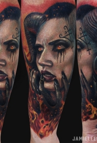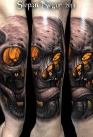手臂新传统风格的彩色人类头骨与蛇纹身