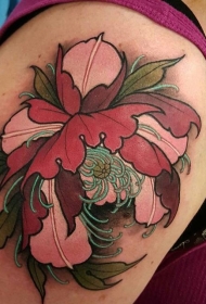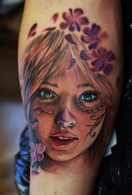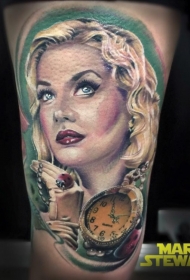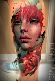 小腿new school彩色玫瑰和女人肖像纹身图案