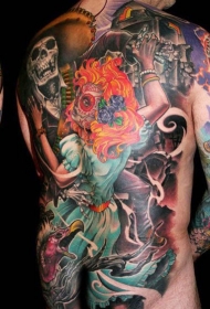 墨西哥本土传统彩色骷髅女郎满背纹身图案