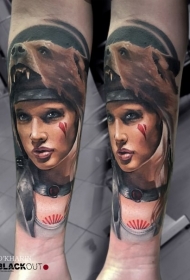 小臂新传统风格彩色熊头女人肖像纹身图案