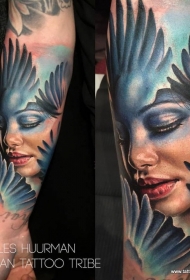 小臂彩色现代传统风妇女与鸟翅膀纹身图案