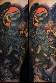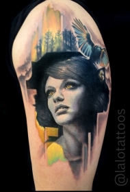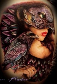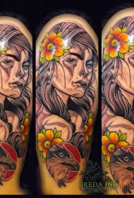 大臂new school彩女人脸与大鸟纹身图案