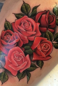 新传统风格彩色美丽的玫瑰腿部纹身图案