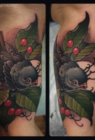 大臂内侧新传统风格彩色浆果和小鸟纹身图案