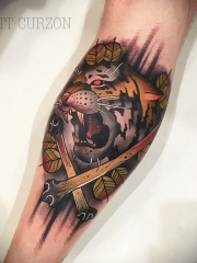 新传统风格的彩色老虎纹身图案