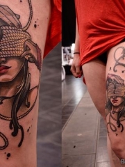 腿部蒙眼睛的女人纹身图案