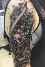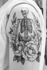 男生大臂上黑灰点刺简单线条花朵和骷髅骨架纹身图片