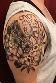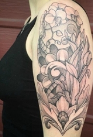女生大臂上黑灰点刺简单抽象线条植物花朵纹身图片
